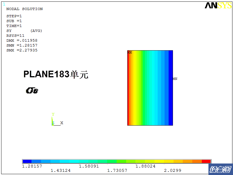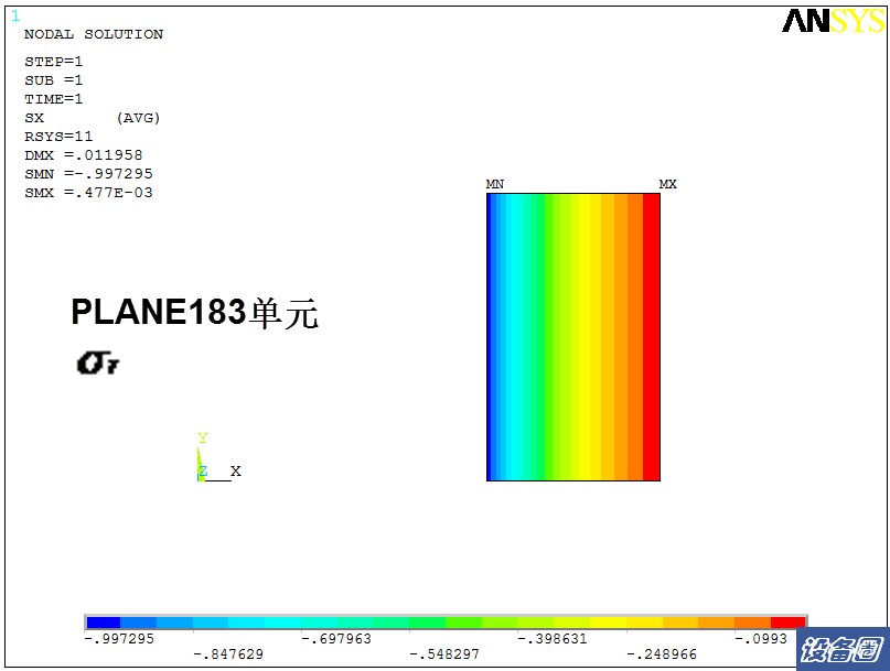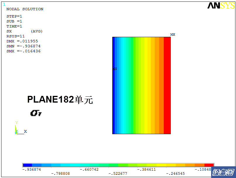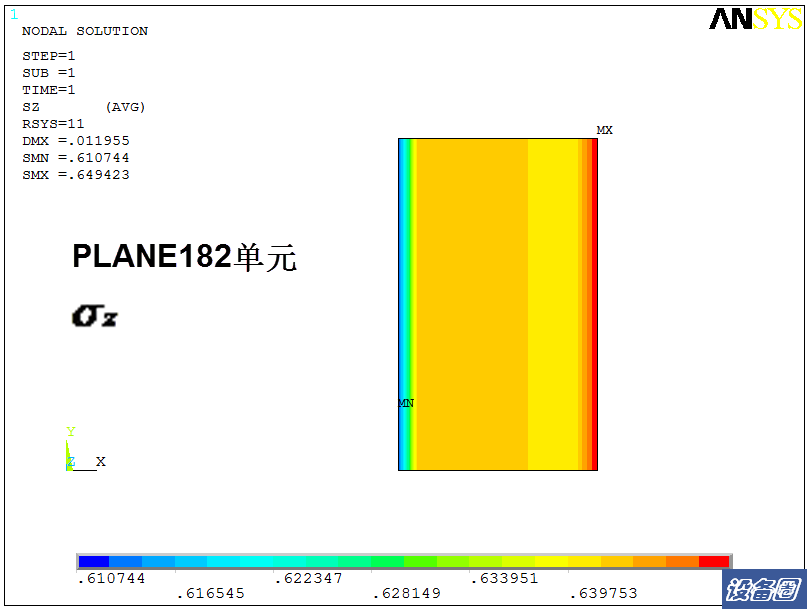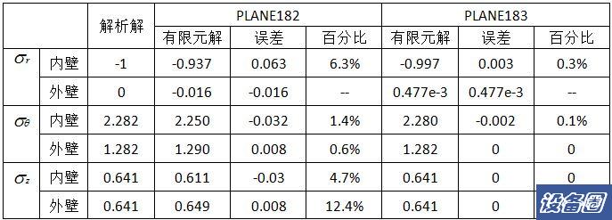 验证弹性解的正确性:根据拉美公式,厚壁圆筒的解析解见表1。以计算内压Pi=1MPa;径比K=Ro/Ri=1.6为例分别采用PLANE182和PLANE183单元建立轴对称模型,计算结果见图4。