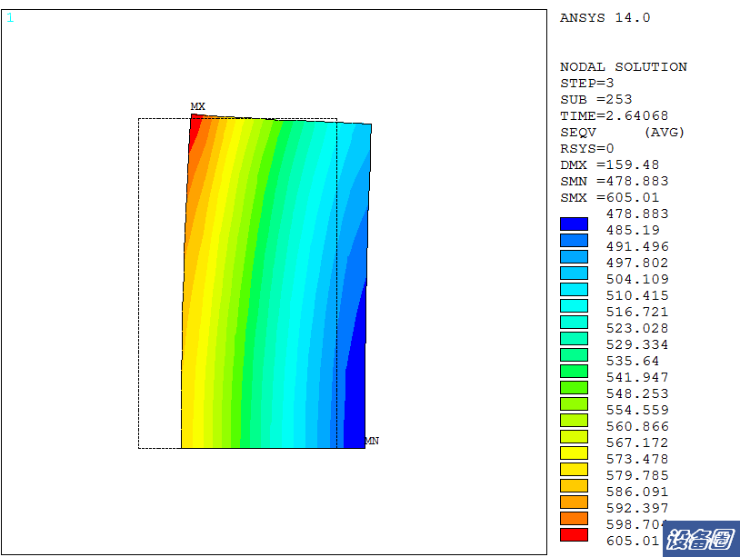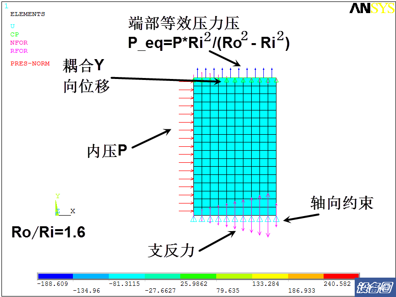 做课题时遇到一个厚壁筒弹塑性分析的例子,当时没有认真分析厚壁圆筒的边界条件,凭借之前的经验施加载荷和约束(见图1),按照应力-应变数据定义了材料模型,就开始计算,结果算出的结果和预期并不相符(见图2)。